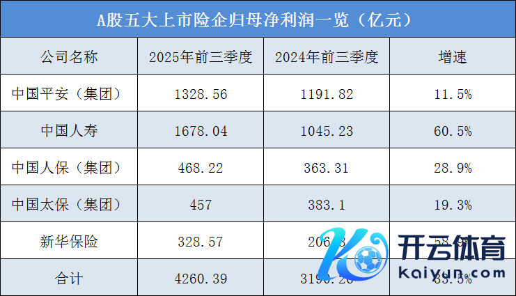 据《国外金融报》记者统计,中国东谈主寿、中国东谈主保、中国祥瑞、中国太保、新华保障在2025年前三季度整个终了归母净利润4260.39亿元,同比增长33.5%,跨越客岁全年净利润总数(3476亿元)。