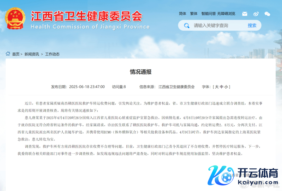 拜谒发现,救护车通盘方南昌赣医病院存在收费分离理等问题。现在,卫生健康行政部门已责令其退回了分离理收费,并暂停医疗转运工作。下一步,我委将聚拢联系职能部门对事件进一步拜谒核查,如发现非法犯警问题将严肃查处,同期对转运救护车表率使用加强监管,刚毅颐养患者职权。