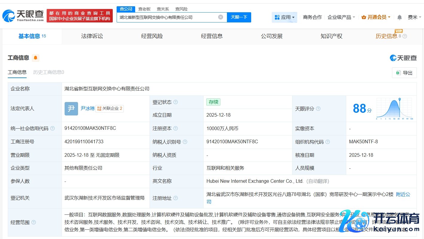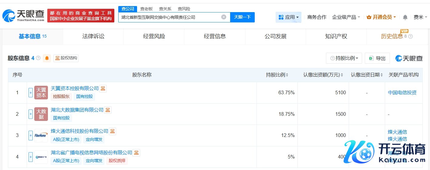 每经AI快讯云开体育,天眼查App深远,近日,湖北省新式互联网交换中心有限包袱公司竖立,法定代表东谈主为尹冰琳,注册老本1亿元东谈主民币,研究领域包括互联网数据职业、数据措置职业、狡计机软硬件及接济开发批发、狡计机软硬件及接济开发零卖等,由中国电信(601728)旗下天翼老本控股有限公司、湖北大数据集团有限公司、焚烧通讯(600498)、湖北广电(000665)共同抓股。