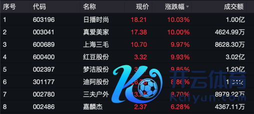 另外,纺织服装板块冲高,日播先锋、真爱好意思家涨停,红豆股份、迪阿股份、梦洁股份等涨幅居前。