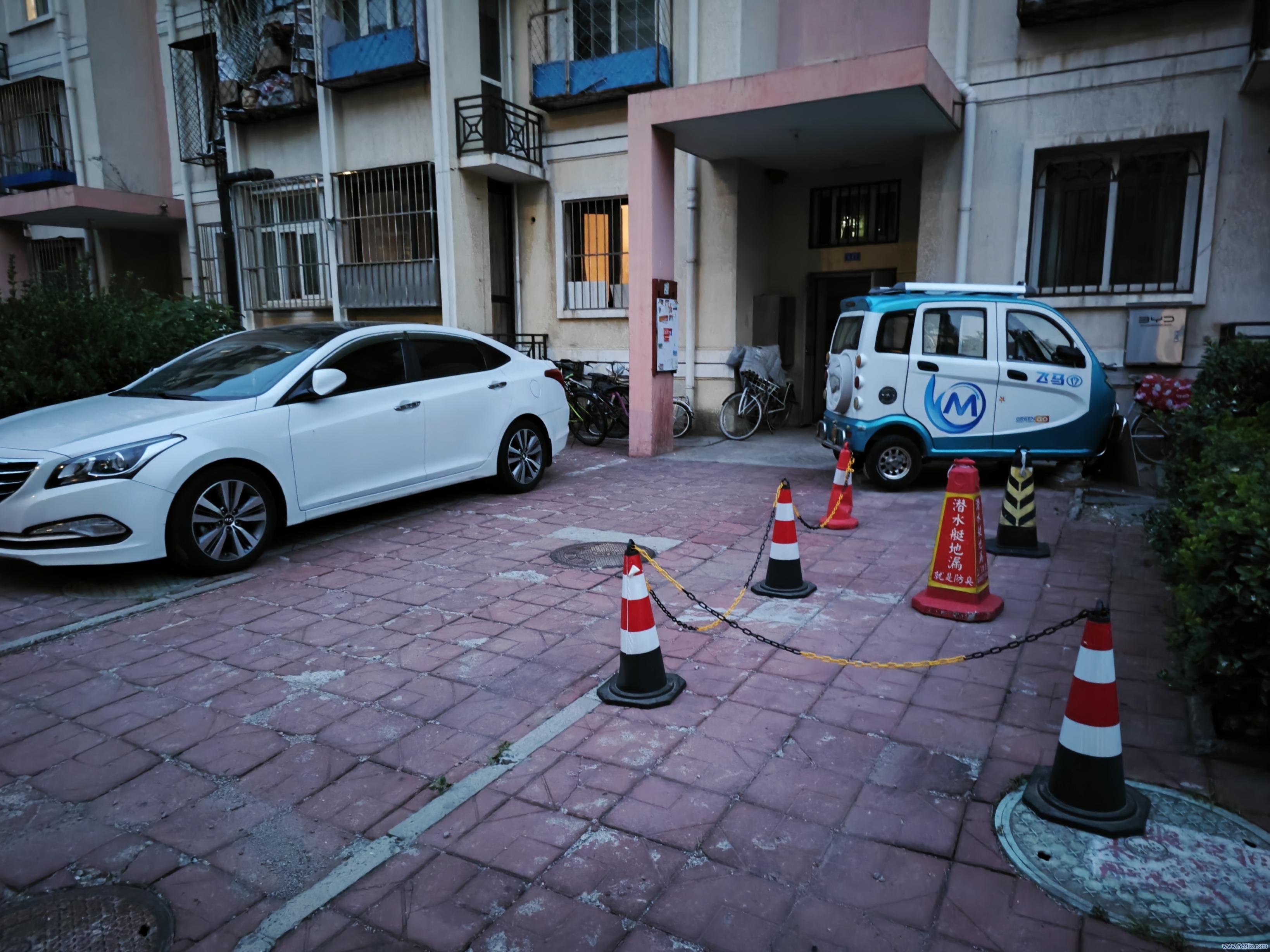 单位楼门口的非生动车停放区被锥桶圈起占位。