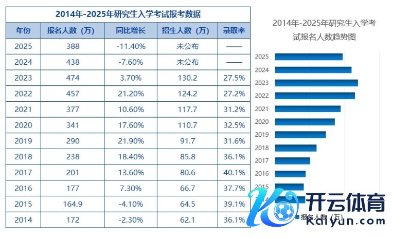 自2016年头始,考研报名东说念主数曾相连八年递加,从2015年的164.9万东说念主上升到2023年的474万东说念主。其中,2019年及2022年同比上年增长率更是超越了20%。而2024年寰宇硕士参议生招生老成报名东说念主数为438万,较2023年的474万减少了36万,同比下落约7.6%,2025年下落比例进一步上升,达到了11.4%。