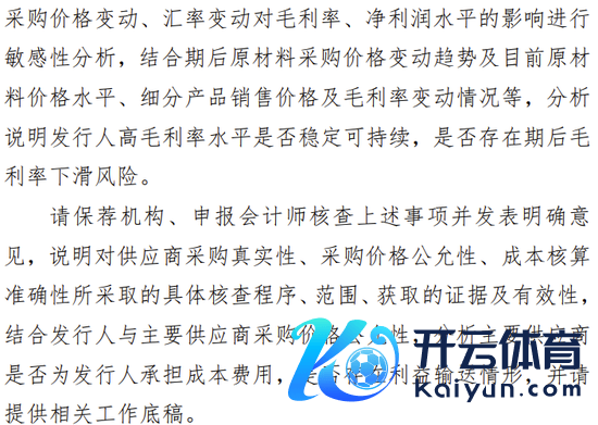 第三轮审核问询函”问题3.毛利率捏续增长的合感性及高毛利率可捏续性”条件公司诠释:毛利率捏续增长的合感性;毛利率较高的可捏续性。条件保荐机构、申报司帐师核查上述事项并发标明确见地,说明对供应商采购实在性、采购价钱公允性、成本核算准确性所接受的具体核查花式、范围、获取的凭据及有用性,鸠合刊行东谈主与主要供应商采购价钱公允性,分析主要供应商是否为刊行东谈主承担成本用度,是否存在利益运送情形,并请提供相干职责底稿。