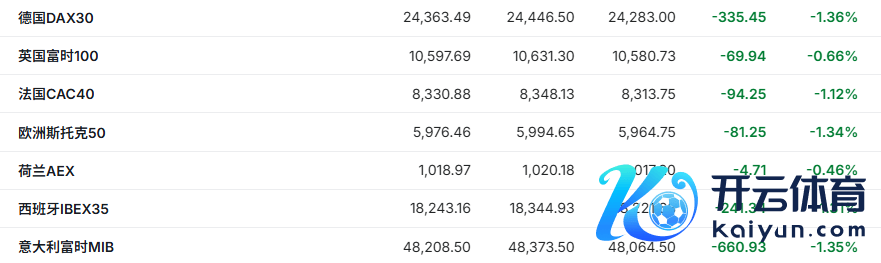 正在交往的欧洲股市巨额走低,德国DAX指数现跌1.36%,英国富时100指数跌0.66%,法国CAC40指数跌1.12%。
