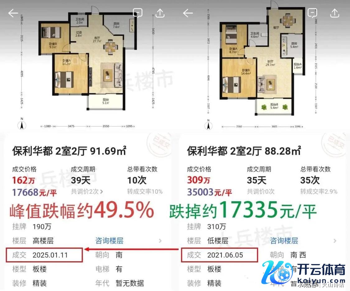 这个叫保利华齐的楼盘,一套2房2厅90平米凹凸的屋子,在2021年6月成交单价为35003元,总价高达309万。到了2025年1月,同户型单价跌至17668元,总价降至162万。也便是说,这套房不到4年的技术,市值挥发掉了近一半。
