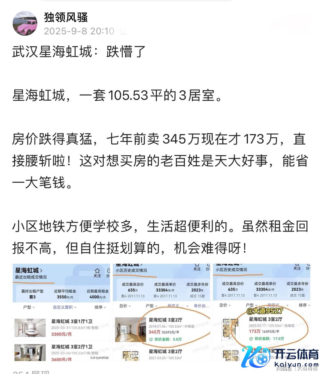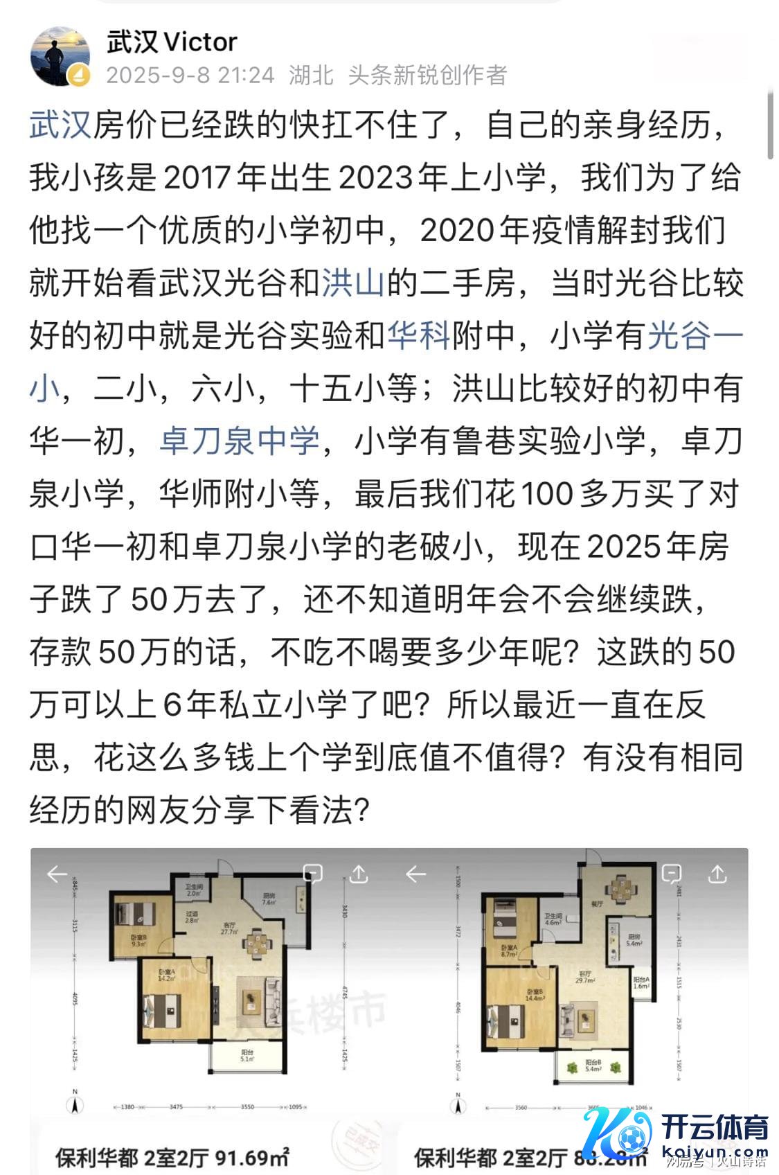 近日有湖北网友发帖称,武汉房价仍是跌的快扛不住了。我方的切身阅历开云官网切尔西赞助商,我小孩是2017年出身2023年上小学,咱们为了给他找一个优质的小学初中,2020年疫情解封咱们就开动看武汉光谷和洪山的二手房。
