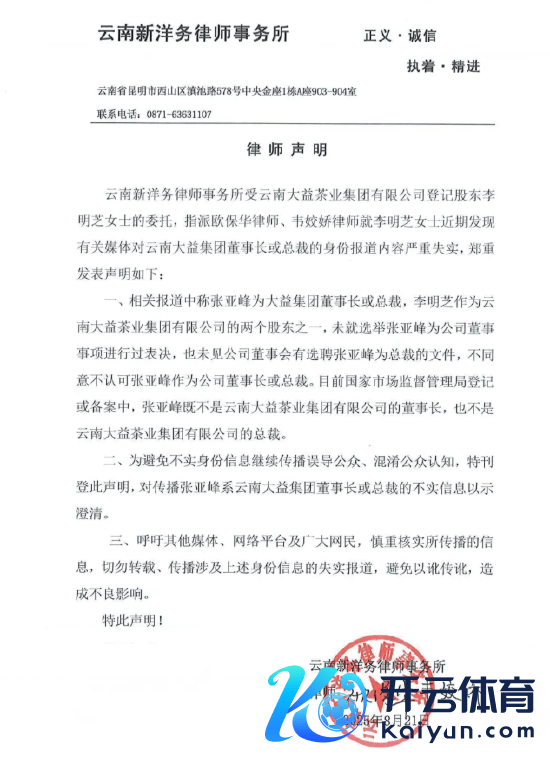 近日云开体育,云南大益茶业集团有限公司登记鼓吹李明芝录用云南新洋务讼师事务所,就近期关系媒体对云南大益集团董事长或总裁身份的报谈发表声明。 声明如下: 一、联系报谈中称张亚峰为大益集团董事长或总裁,李明芝算作云南大益茶业集团有限公司的两个鼓吹之一,未就选举张亚峰为公司董事事项进行过表决,也未见公司董事会有选聘张亚峰为总裁的文献,不答应不招供张亚峰算作公司董事长或总裁。当今国度市集监督处理总局登记或备案中,张亚峰既不是云南大益茶业集团有限公司的董事长,也不是云南大益茶业集团有限公司的总裁。 二、